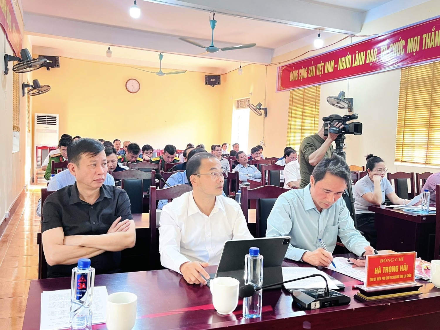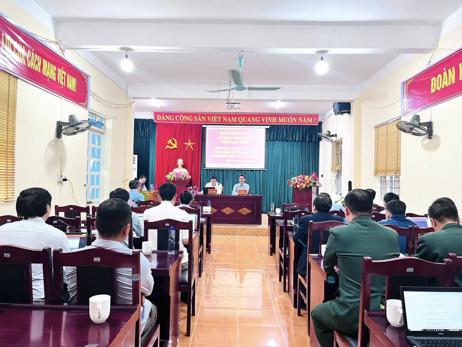 Làm việc với đoàn về phía xã Mường Kim có đồng chí Nguyễn Văn Thăng- Bí thư Đảng uỷ, chủ tịch HĐND xã, đồng chí Đoàn Văn Đạt- Phó bí thư thường trực Đảng uỷ, đồng chí Vũ Văn Nội- Phó bí thư Đảng uỷ, Chủ tịch UBND xã, các đồng chí thường trực Đảng uỷ- HĐND- UBND, các ban ngành đoàn thể xã.