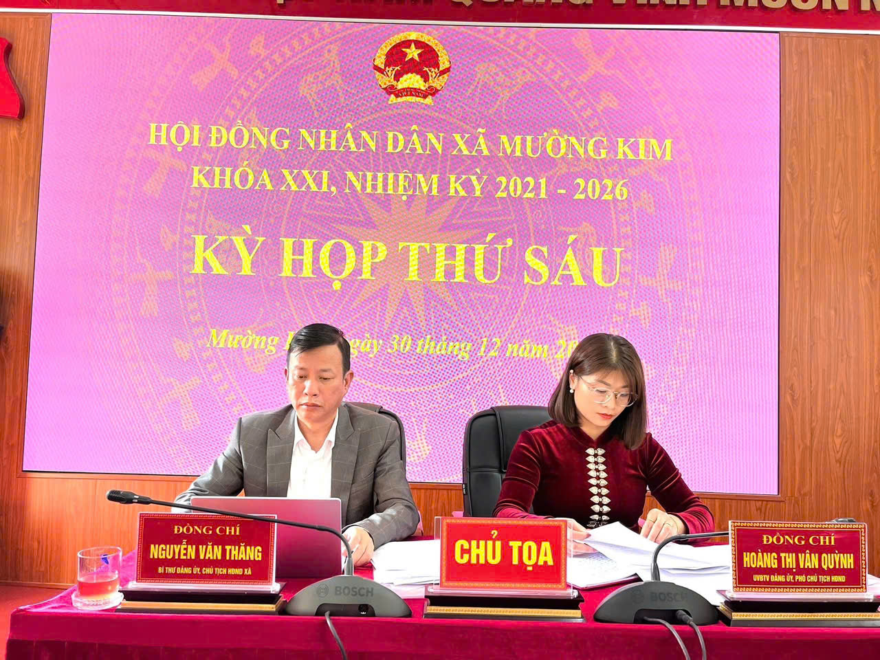 Các đồng chí: Nguyễn Văn Thăng - Bí thư Đảng ủy, Chủ tịch HĐND xã; Hoàng Thị Vân Quỳnh - Phó Chủ tịch HĐND xã Mường Kim đồng chủ trì kỳ họp. Dự kỳ họp có các đồng chí trong Thường trực Đảng ủy, HĐND, UBND, Ủy ban MTTQ Việt Nam, đại diện các ban, ngành, đoàn thể cùng đại biểu HĐND xã. Tại kỳ họp, các đại biểu được nghe các báo cáo: tổng kết hoạt động của Ủy ban nhân dân xã nhiệm kỳ 2021-2026 và phương hướng, nhiệm vụ nhiệm kỳ 2026-2031; công tác nhiệm kỳ khóa XXI, nhiệm kỳ 2021-2026 của HĐND xã. Đồng thời, thông qua tờ trình đề nghị ban hành Nghị quyết phân bổ, bổ sung kinh phí thực hiện các chế độ chính sách và các nhiệm vụ phát sinh năm 2025.Thảo luận tại kỳ họp, các đại biểu tập trung vào các nội dung: kết quả hoạt động của UBND xã nhiệm kỳ 2021 - 2026; hoạt động của HĐND xã…Với tinh thần dân chủ, trách nhiệm, các đại biểu biểu quyết thông qua Nghị quyết phân bổ, bổ sung kinh phí thực hiện các chế độ chính sách và các nhiệm vụ phát sinh năm 2025.