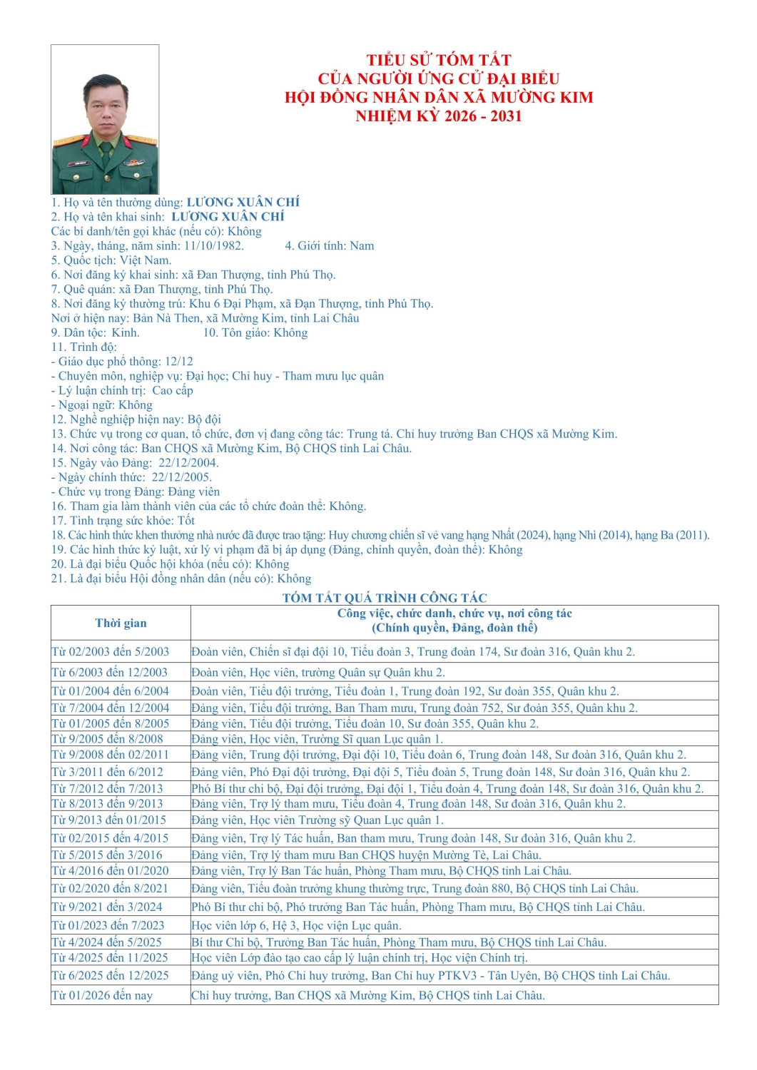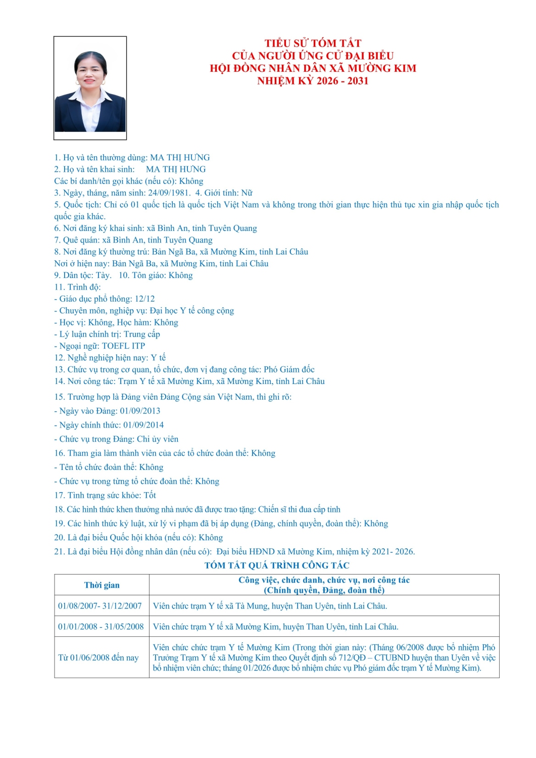 TIỂU SỬ TÓM TẮT NHỮNG NGƯỜI ỨNG CỨ ĐẠI BIỂU HĐND XÃ MƯỜNG KIM KHÓA XXII NHIỆM KỲ 2026 - 2031. ĐƠN VỊ BẦU CỬ SỐ 01